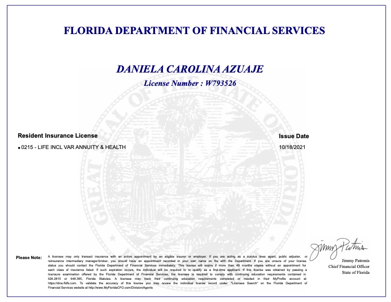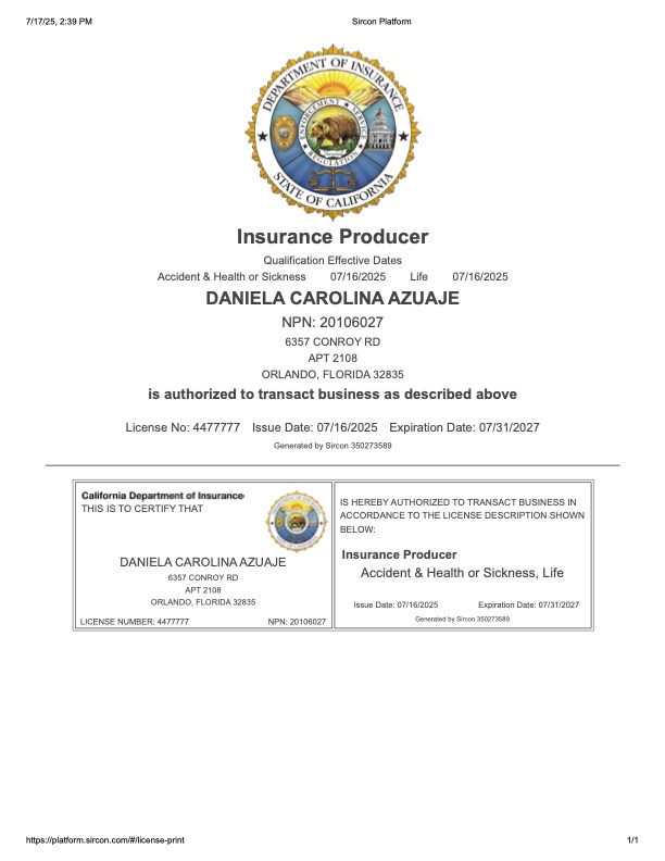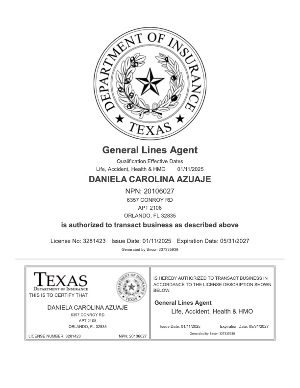 Soy un agente de seguros licenciado en más de 10 estados de los Estados Unidos, cumpliendo con todos los requisitos y regulaciones tanto a nivel estatal como federal.